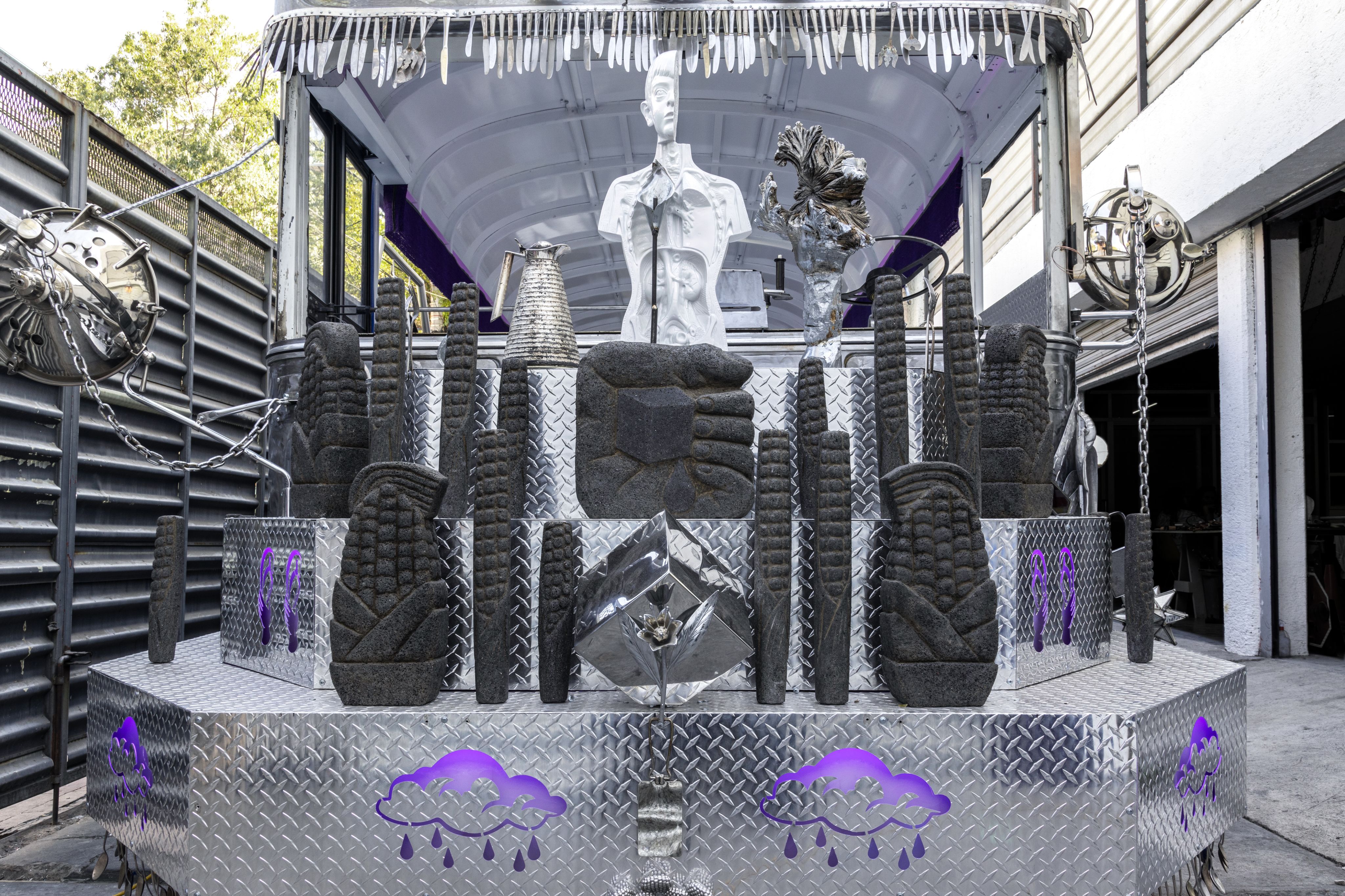 Mariposa Relámpago, which translates to Lightning Butterfly, is the artist’s largest sculpture to date. Maravilla’s sculptures known as Disease Throwers, incorporate natural materials, handmade objects, and items collected while retracing his migratory route. Every sculpture includes metal gongs that are activated by the artist during public sound baths to deploy the powers of vibrational sound as a form of healing. Maravilla’s artworks also contain a cosmology of potent symbols and objects that connect the artist’s personal journey with ancient practices of the Indigenous Mayan peoples; diverse spiritual and folk beliefs; and contemporary crises of disease, ecology, and war. Mariposa Relámpago functions as a sculpture, shrine and healing.