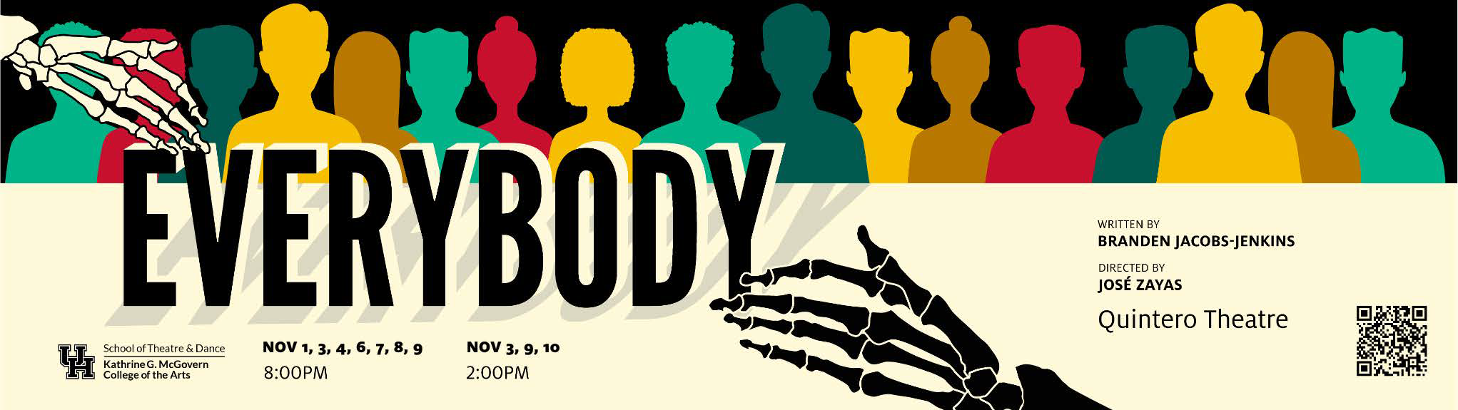 Everybody is a modern comic adaptation of the 15th Century morality play Everyman and one of the first recorded plays in the English language. This modern adaptation sees Everybody visited by God and Death, as well as Friendship, Kinship, all their Stuff, and a few surprising others as they prepare for a journey into the hereafter. It questions the meaning of life, death, and everything in between.